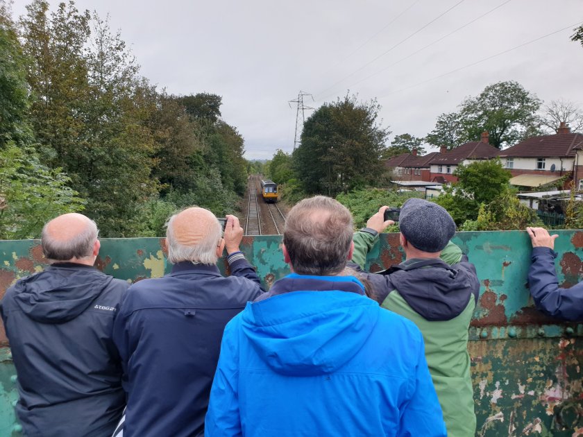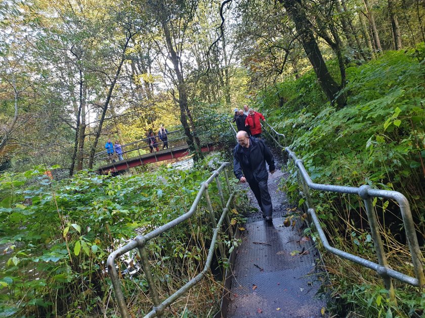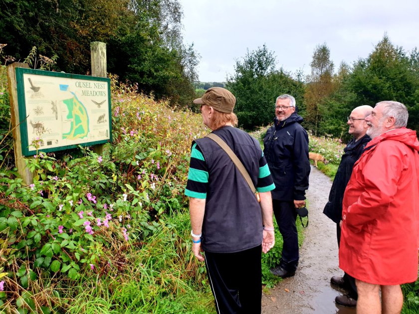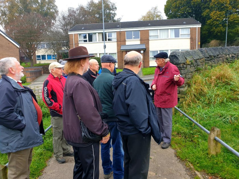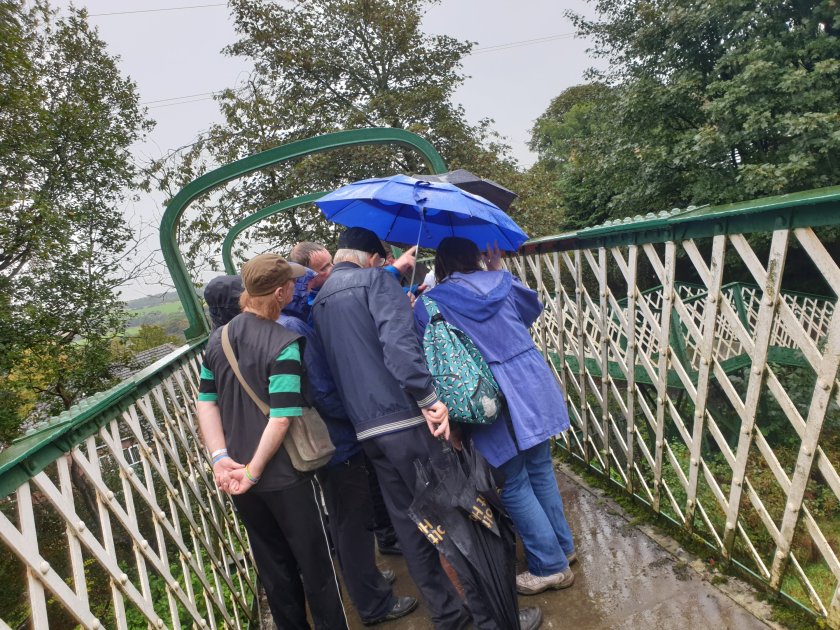 Pausing on the bridge close to the dam, holding back the water for Jumbles reservoir, created 1970s. On the bridge over the railway line.We paused to look at some photos showing steam trains, presented by local historian David.