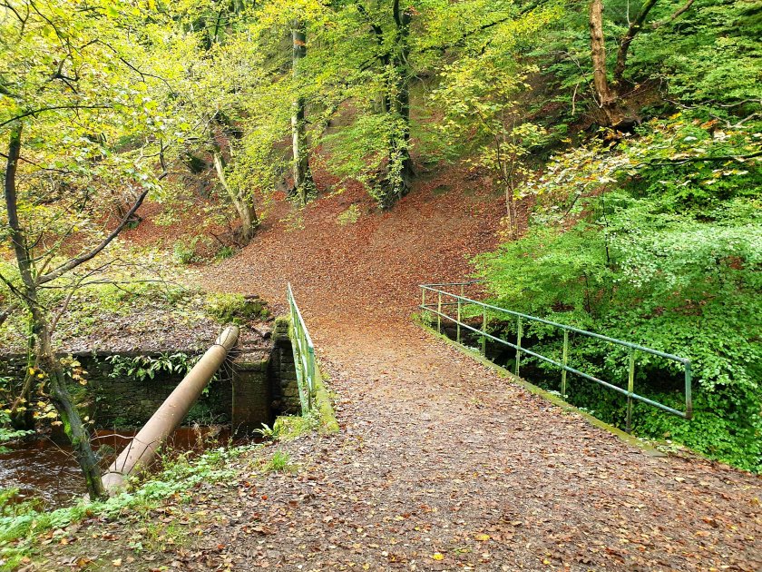 The path to the left brings us out onto a lodge; water stored here for Hardcastle’s Bleachworks.